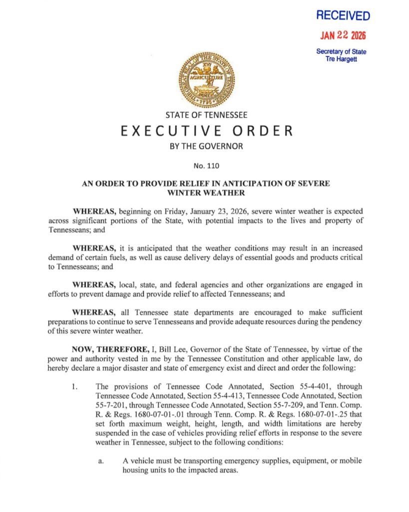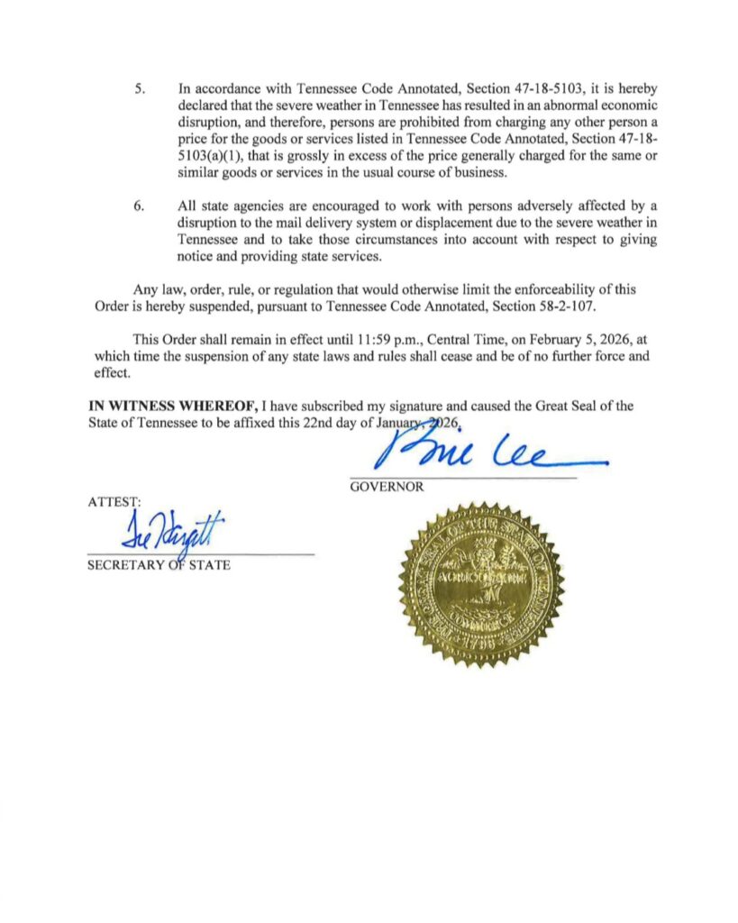 La orden firmada por el gobernador Bill Lee estará vigente hasta el 5 de febrero de 2026, a las 11:59 p.m., salvo que sea extendida o modificada.