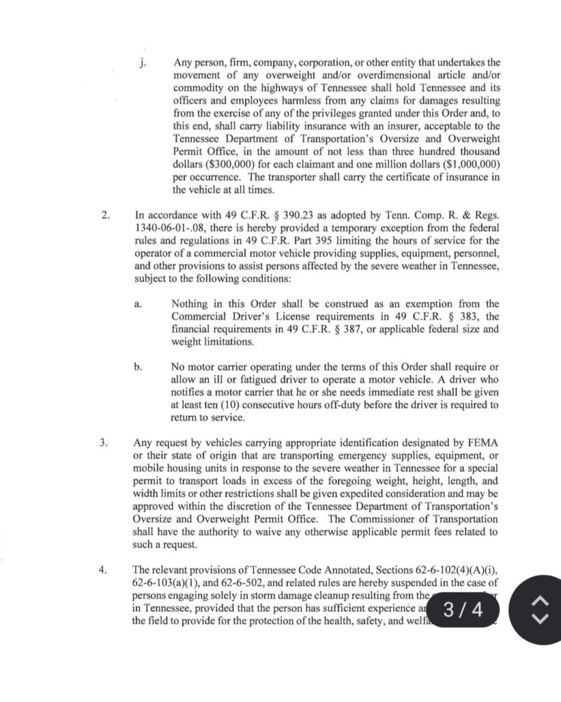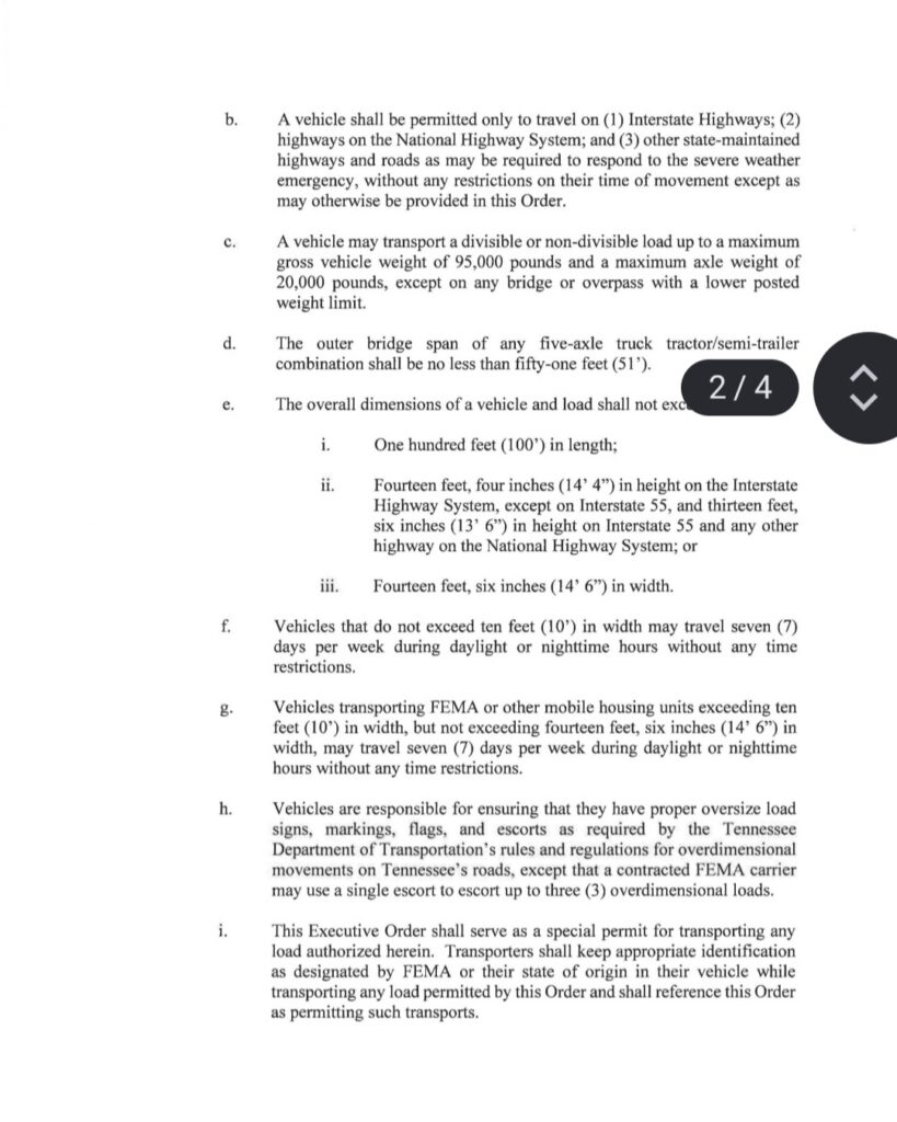 Sí. La orden suspende temporalmente límites de peso y tamaño para vehículos que transporten ayuda de emergencia.